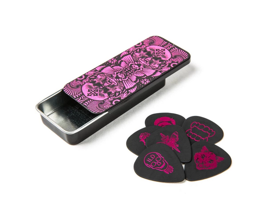 Набор медиаторов с дизайном ILOVEDUST, из подлинного материала Tortex, толщина 0.88 мм, 6 штук в комплекте, набор поставляется в стильной металлической коробочке, подоходят для профессиональных гитаристов, производство США.