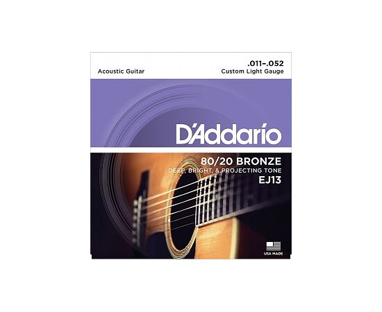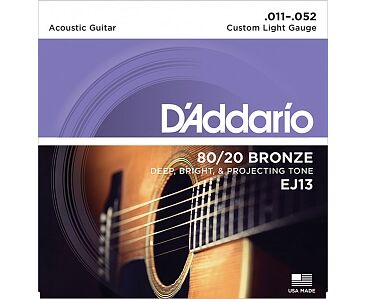 Струны EJ13, названные Custom Light, являются оригинальным гибридом толщины от компании D'Addario. Удобный компромисс для музыкантов ищущих глубину и отчетливость тонких струн, но предпочитающих меньшее натяжение для исполнения бендов.