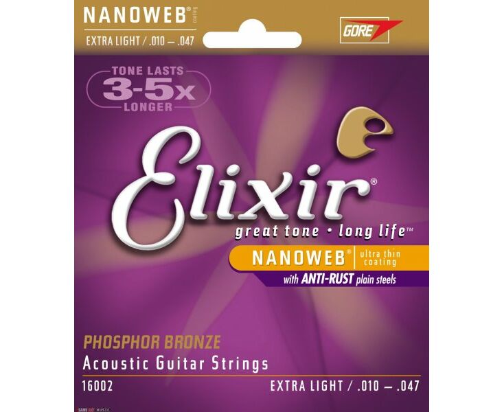 Elixir 16002 NANOWEB Комплект струн для акустической гитары, Extra Light, фосфорная бронза, 10-47