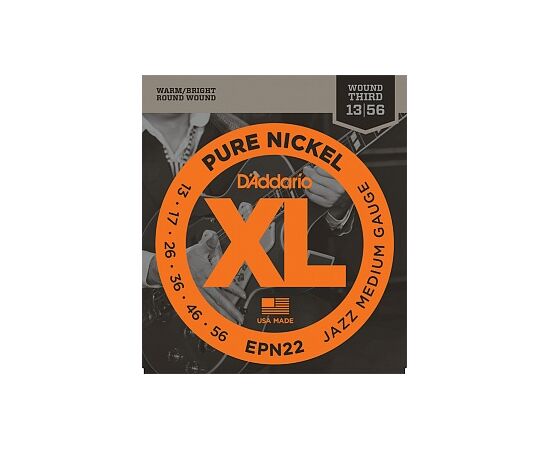 EPN22 XL PURE NICKEL Струны для электрогитары чистый никель Jazz Medium 13-55 D`Addario EEPN22 019954968953 D'Addario EPN22 Pure Nickel Electric Guitar Strings, Jazz Medium, 13-55 Комплект струн EPN22 сочетает в себе легкость игры, присущую струнам средней толщины, с теплым, винтажным звучанием. Струны D'Addario XL Pure Nickel для электрогитары из чистого никеля позволяют оглянуться назад в 50е годы, когда никель был основным материалом для электрогитарных струн. Чистый никель был вытеснен никелированной сталь в 60е годы, когда гитаристом требовался более яркий звук и увеличенная магнитная отдача. Струны из чистого никеля дают более богатый, теплый звук, традиционный для блюза, классического рока, рокабилли и других направлений. D'Addario - крупнейший в мире производитель струн для музыкальных инструментов, имеющий репутацию производителя с непревзойденным качеством. Инновационная упаковка, разработанная D'Addario, не наносит вред окружающей среде, защищает струны от загрязнения и коррозии. Все струны D'Addar