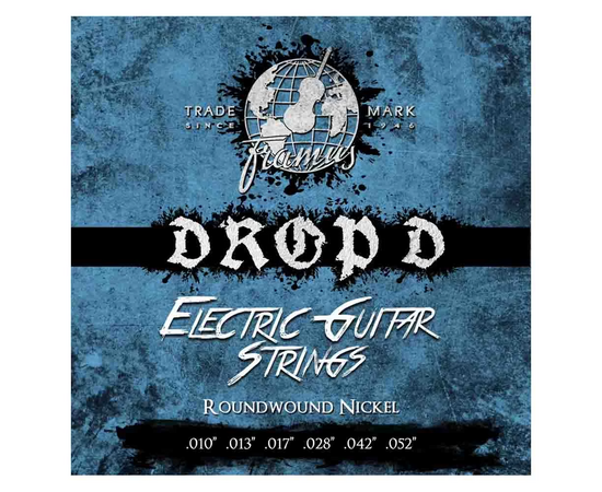 Струны для электрогитары, Drop D и Db, никелированная сталь, шестигранный сердечник, круглая обмотка, толщина .010", .013", .017", .028", .042", .052".