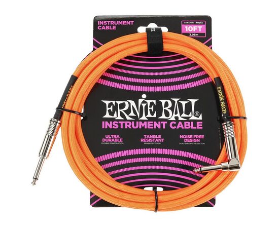 ERNIE BALL 6079 - кабель инструментальный, оплетёный, 3,05 м, прямой/угловой джеки, оранжевый неон