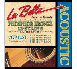 7GP12XL Extra Light Комплект струн для акустической 12-струнной гитары. Струны без оплетки - сталь, струны в оплетке - стальной керн в оплетке из фосфорной бронзы. 9/9-12/12-20w/8p-28/12p-38/20p-48/26w La Bella США