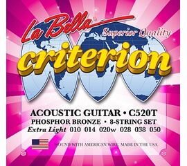 C520T Criterion Extra Light Комплект струн для акустической гитары. Верхние струны - сталь, басове струны - сталь оплетке из фосфорной бронзы. Компект содержит дополнительные 1 и 2 струны. 010-014-020w-028-038-050 La Bella