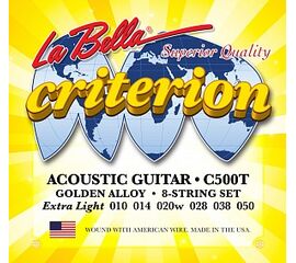 C500T Criterion Extra Light Комплект струн для акустической гитары. Верхние струны - сталь, басове струны - сталь в бронзовой оплетке. Компект содержит дополнительные 1 и 2 струны. 010-014-020w-028-038-050 La Bella
