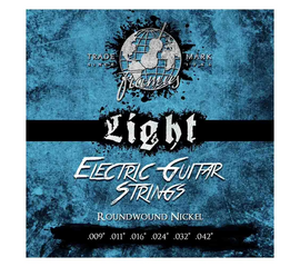 Струны для электрогитары, лёгкое натяжение (Light), никелированная сталь, шестигранный сердечник, круглая обмотка, толщина .009", .011", .016", .024", .032", .042".