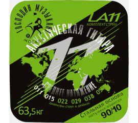 LA11 90/10 Комплект струн для акустической гитары, латунь Л-90, 11-54, Господин Музыкант Первые струны — высокоуглеродистая латунированная сталь (страна происхождения — Белоруссия). Басовые струны — профильный керн, оплетка из латуни марки Л-90 (90% медь и 10% цинк). Страна происхождения —...