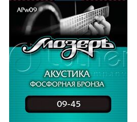 APw09 Комплект струн для акустической гитары, фосфорная бронза, оплетка 3-ей струны, 9-45, Мозеръ Основа струн: сталь (ФРГ). Оплетка: фосфорная бронза (США). Третья струна в оплетке. Толщины струн: 009-045. Суперлегкое натяжение 44кг. Струны устойчивы к механическому и химическому износу...