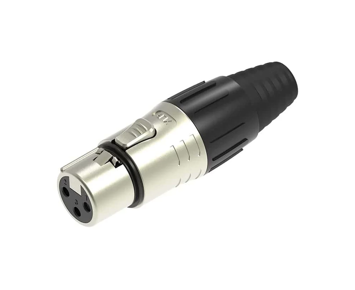 3-жильный кабельный разъем XLR «мама» с никелированным корпусом и посеребренными контактами, металлический корпус, дизайн Noring, чехол оснащен полиуретановой уплотнительной манжетой.