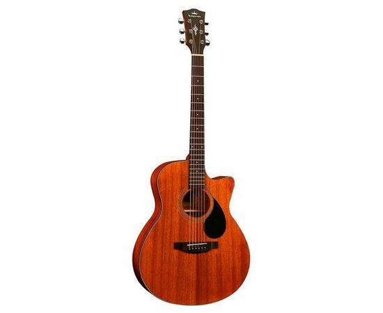 KEPMA EACE-K1-WAM Matt – электроакустическая гитара из серии E, выполненная в корпусе Grand Auditorium (40") с вырезом (cutaway). Верхняя дека, нижняя дека и обечайка изготовлены из ламинированного махагони. X-образная раскладка усиливает резонанс и формирует сбалансированное звучание. Гриф из окуме с матовой сатиновой отделкой оснащён накладкой и бриджем из индонезийского палисандра. Мензура 648 мм и 20 ладов с акриловыми маркерами дают удобство при игре. Порожек и вставка на бридже из материала Harden Edcgear способствуют точной передаче вибрации струн. Хромированные колки с закрытым механизмом вместе со струнами KEPMA 011–052 из фосфорно-бронзового сплава поддерживают стабильную настройку. Электроника KEPMA K1 включает 3-полосный эквалайзер и встроенный тюнер. ТОО "Самат шоу техник" является официальным дистрибьютором бренда Kepma.