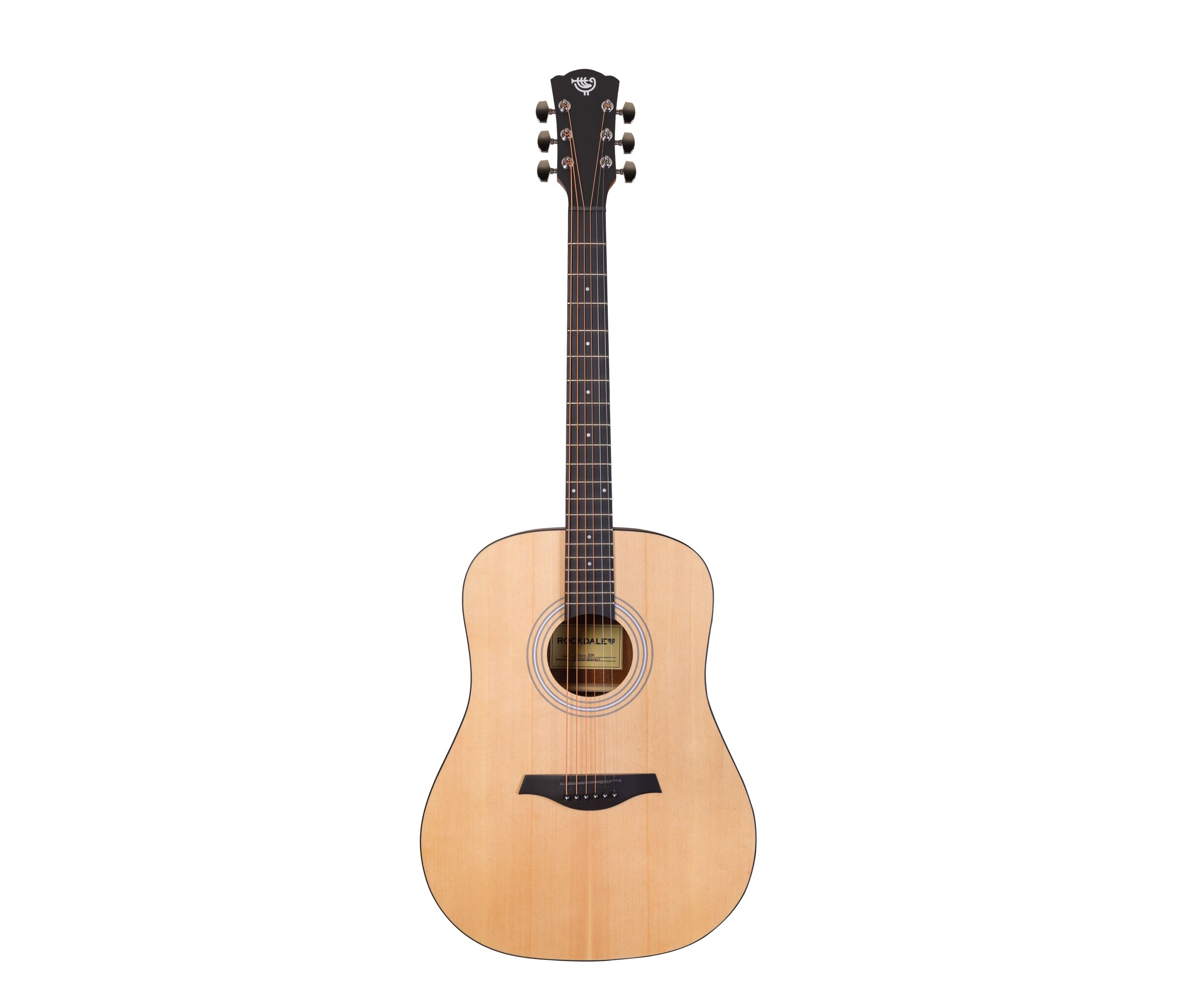 акустическая гитара. Форма корпуса Dreadnought. Цвет натуральный. Сатиновое покрытие верхней деки. Матовое покрытие копруса. Верхняя дека из ели. Нижняя дека и обечайка из махагони. Гриф из красного дерева. Анкерный стержень. Накладка на гриф из древесно-полимерного композита. Закрытые колки.