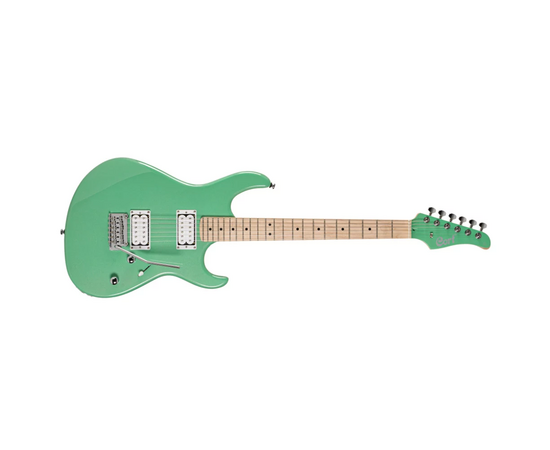 Электрогитара, корпус из американской липы, гриф из твердого клена с накладкой из твердого клена радиусом 15,75 дюйма (400 мм), комплект звукоснимателей Cort® Alnico V H-H, бридж с 2-х точечным тремоло с металлическим струнодержателем; 1 громкость, 1 тон, 3-х позиционный переключатель, цвет зеленый металлик (Metallic Green).