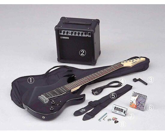 В набор входит: гитара, чехол, ремень, комплект струн, 3 медиатора, ключ для установки струн, усилитель GA15, тюнер YT100, провод.