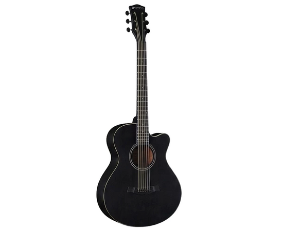 Акустическая гитара, размер 40", форма гранд аудиториум, верхняя дека из массива ели, нижняя дека и обечайка из сапеле, гриф из окуме с накладкой из композитной древесины, стальные струны, литые колки, матовая отделка, розетка и окантовка ABS, чёрный цвет, в комплекте фирменный чехол.