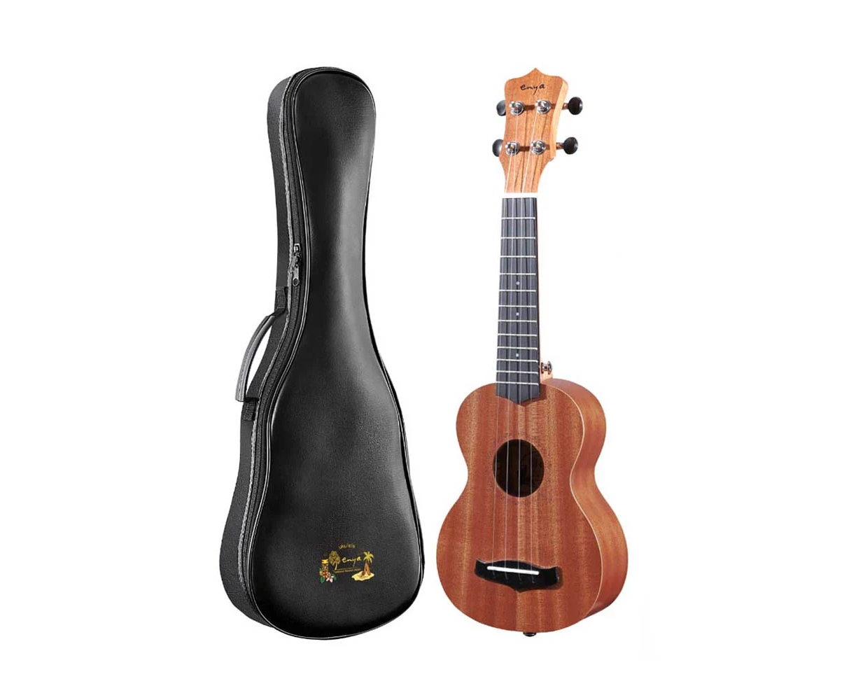 Укулеле размера сопрано, верхняя дека, нижняя дека и обечайка из сапеле; гриф из древесины Окуме, бридж и накладка на гриф из палисандра, колки Rubber Die-Cast, порожек и седло Nubone, струны Enya Ukulele Strings, матовая отделка корпуса, в комплекте чехол Enya Bag.
