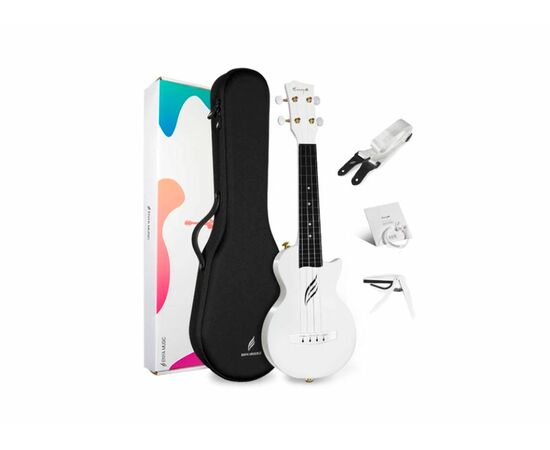 Укулеле размера сопрано; корпус, гриф и бридж из углеродного волокна и поликарбоната (карбон) 30%; устойчива к любым погодным условиям, колки Open Gold Classic, струны Fluorocarbon, в комплекте: фирменный чехол, набор запасных струн, ремень и каподастр.