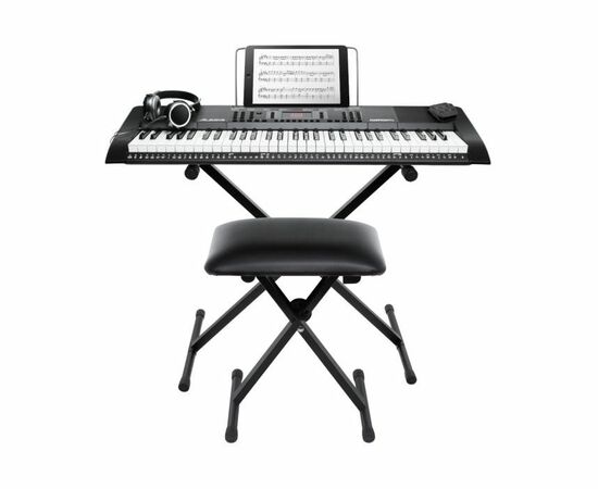 Наушники, педаль сустейна, подставка для клавиатуры и скамья в комплекте — все, что вам нужно, чтобы начать играть прямо сейчас!