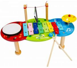 1 столик; 1 металлофон (8 нот) с 2 палочками; 1 треугольник с держателем и палочкой; 1 деревянный тамбурин; 1 тарелка на стойке.