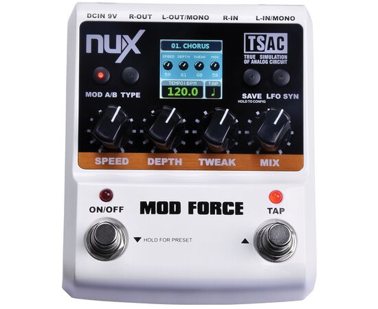 Типы эффектов: 12 моделей модуляционных эффектов Количество пресетов: до 9-ти сохраняемых пользовательских настроек, ручной режим (Manual) Частота семплирования: 44.1кГц АЦ/ЦА преобразование: 24 бит Обработка сигнала: 32 бит Частотная характеристика: 20 Гц - 20 кГц +/- 1 Дб Коэффициент Нелинейных Искажений + Шум: 93 дБ (<0.003%) тип «А» Динамический диапазон: 100 дБ Входное сопротивление: -20 дБ@1 мОм Выходное сопротивление -10 дБ (при выходном сопротивлении нагрузки 10 кОм или больше) Дисплей: 128 х 128 TFT Питание: 9В DC (Батарея 9В, ACD - 007A адаптер) Размеры: Длина: 125, ширина: 108, высота: 57 мм Вес: 390 гр Аксессуары: Инструкция, сертификат, батарея 9В.
