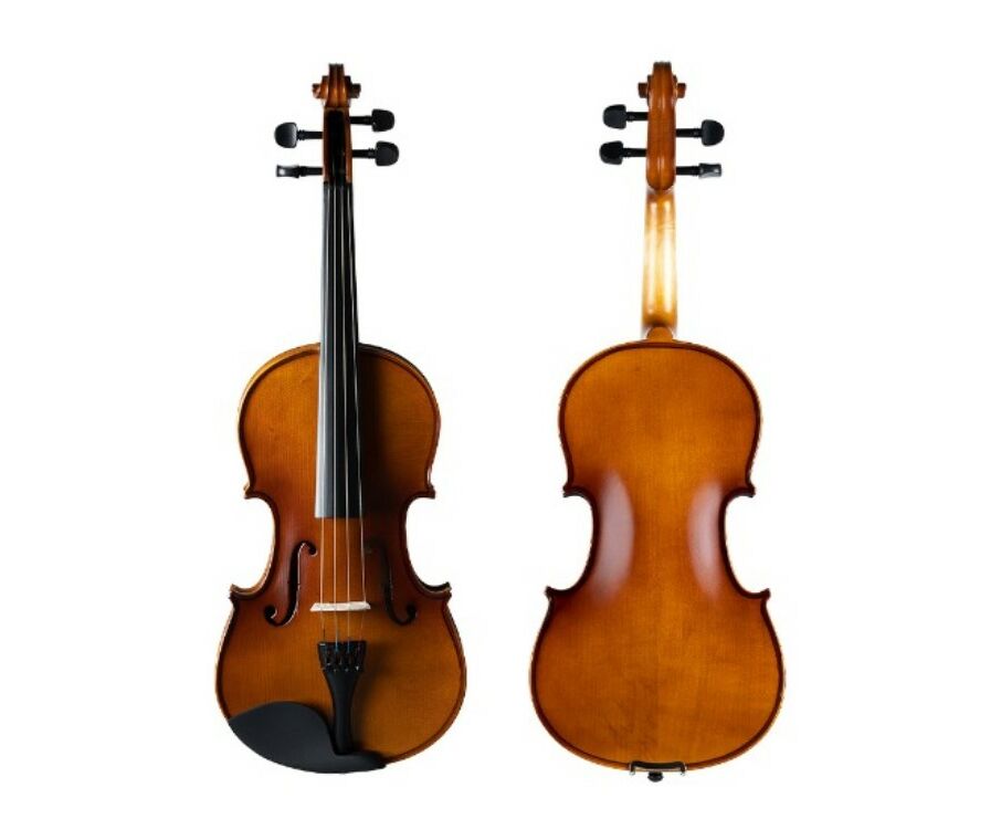 Верхняя дека скрипки изготовлена из резонансной ели, легкой и прочной древесины, высушенной в течении нескольких лет. Для задней деки и обечайки используется из жесткой древесины клена. Машинки на каждой струне облегчают игру начинающим скрипачам.