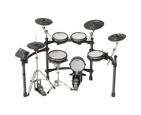 Цифровая ударная установка; конфигурация: 1х малый барабан 12", 3х том барабан 10", 1х бас-барабан 10", 1х хай-хэт тарелка 12", 2х крэш тарелка 10"; 1х райд тарелка 14", стойка малого барабана, стойка хай-хэта, педаль бас-барабана, модуль DM-8.