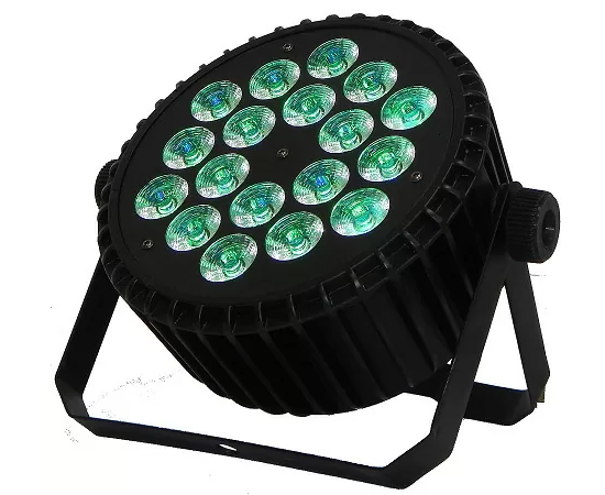 Светодиодный прожектор 18 светодиодов по 10 Вт 4-в-1 RGBW. Строб 1-20 всп/сек. 8 каналов DMX. Угол раскрытия 25°. Вес 4 кг.