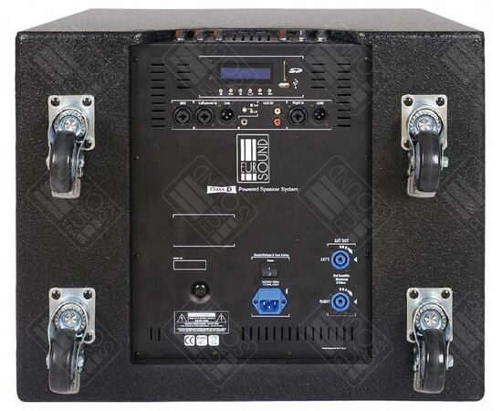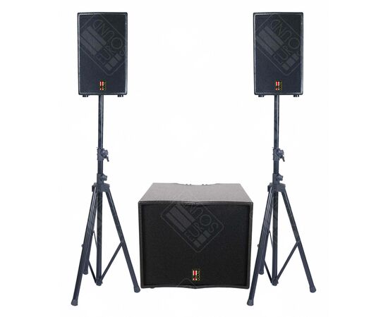 Акустический комплект с USB/SD MP3-проигрывателем и BLUETOOTH интерфейсом, состоящий из активного субвуфера с 15-дюймовым динамиком мощностью 600 Вт и 2 пассивных сателлитов мощностью по 150 Вт с 10-дюймовыми динамиками.