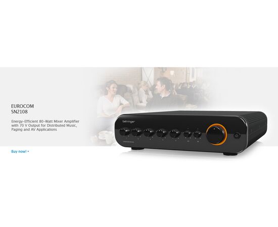 Behringer Eurocom SN2108-EU Микшер-усилитель 3микр+2лин, регулировка тембра, 80Вт@100В, лимитер