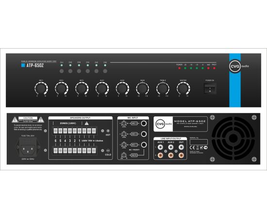 Микшеры-усилители CVGaudio MTR-240Z - 100V Public Address усилитель для систем фонового звука в торговых и общественных помещениях. Помимо традиционных для подобных усилителей линейных и микрофонных входов MTR-240Z имеет встроенный модуль MP3 плеера и FM тюнера. Плеер может проигрывать mp3 файлы с USB флешки или SDcard. FM тюнер имеет память на 20 станций и возможность подключения внешней антенны для более уверенного приема радиотрансляции. Модуль плеера и тюнера может управляться с дистанционного IR пульта, входящего в комплект поставки. Также, как было написано выше, к усилителю можно подключить два источника линейного сигнала (CD, DVD, MP3 плеер, компьютер, ноутбук, планшет и так далее) и два микрофона. Первый микрофонный вход приоритетный и наличие сигнала на нем заглушает все остальные линейные и микрофонные входящие сигналы, а также сигнал с встроенного MP3/FM модуля. Линейные входа усилителя выполнены на разъемах 2RCA, микрофонные входа - TRS 6,3mm Jack (не